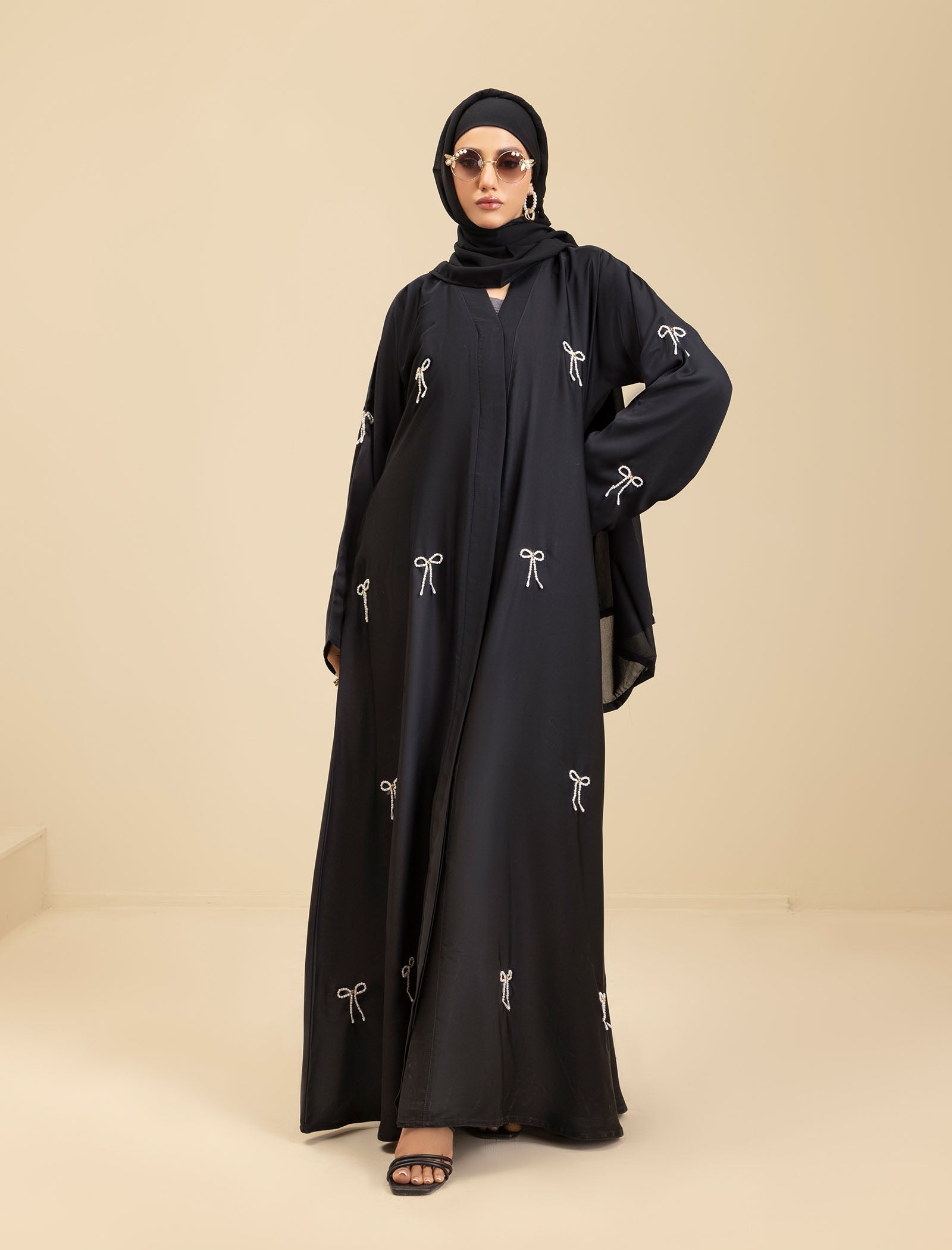 The Midnight Luxe abaya is a true showstopper, crafted with exclusive handwork to create a stunning bow tie detail. Made with premium Saudi Nidah fabric, this black abaya exudes luxury and sophistication, making it the perfect choice for any formal or special occasion.